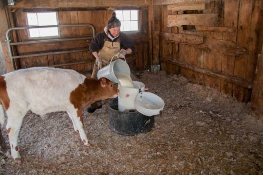 But soon thereafter she began raising her bulls in spacious indoor pens where they drink fresh milk from free feeders and eat hay. In contrast, industrial veal calves are given milk replacer that deliberately keeps their iron and fiber levels low, producing pallid meat. When her calves are four months old and topping roughly 400 lbs. she trailers them to a certified-humane slaughterhouse.